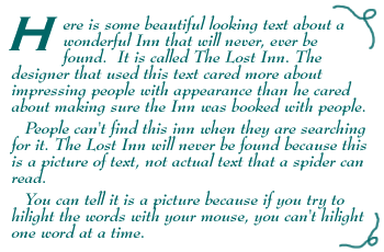 Spiders aren't impressed by the visual part of your website. All they can see is text and links. They can not see pictures. They thrive on words. So with this knowledge, we run into one of the most common mistakes found on B&B websites. Pictures of words! Spiders can't read pictures of words. If they can't read it, they can't report back to the search engine with anything useful. If the search engine has nothing useful recorded about your page, it won't get found by someone using the search engine to choose a B&B to visit. Here are two examples, one is real text, the other is a picture.